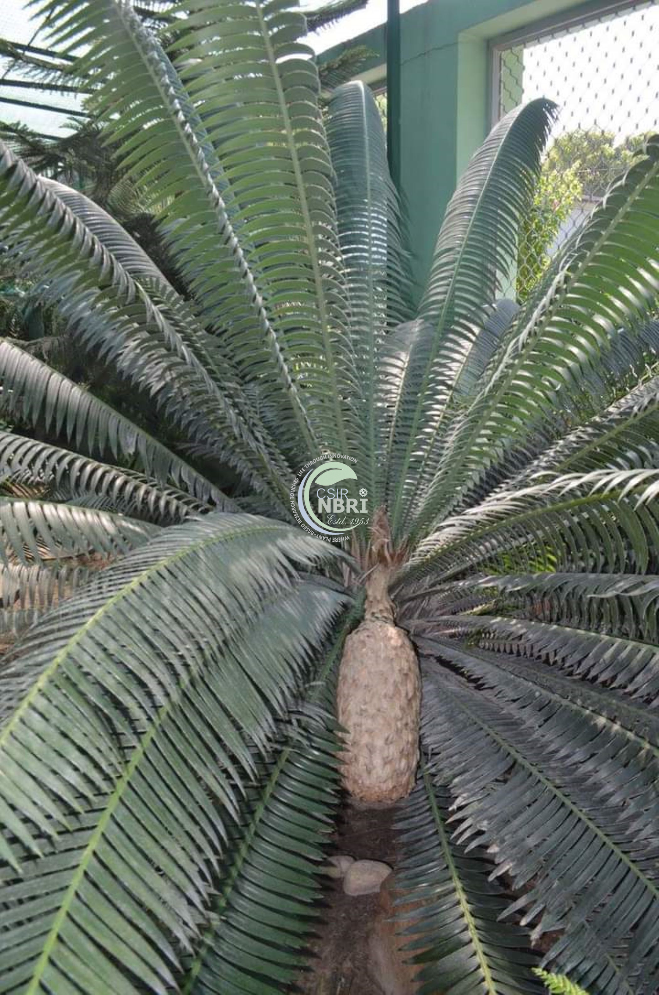 Large cycad with a single or branched trunk, pinnate leaves that are stiff and arching, dioecious plant with separate male and female individuals, cone-bearing plant, cylindrical cones, low position of the cones on the tree, dark green foliage, native to Mexico and known for its ornamental value and ability to withstand drought conditions.