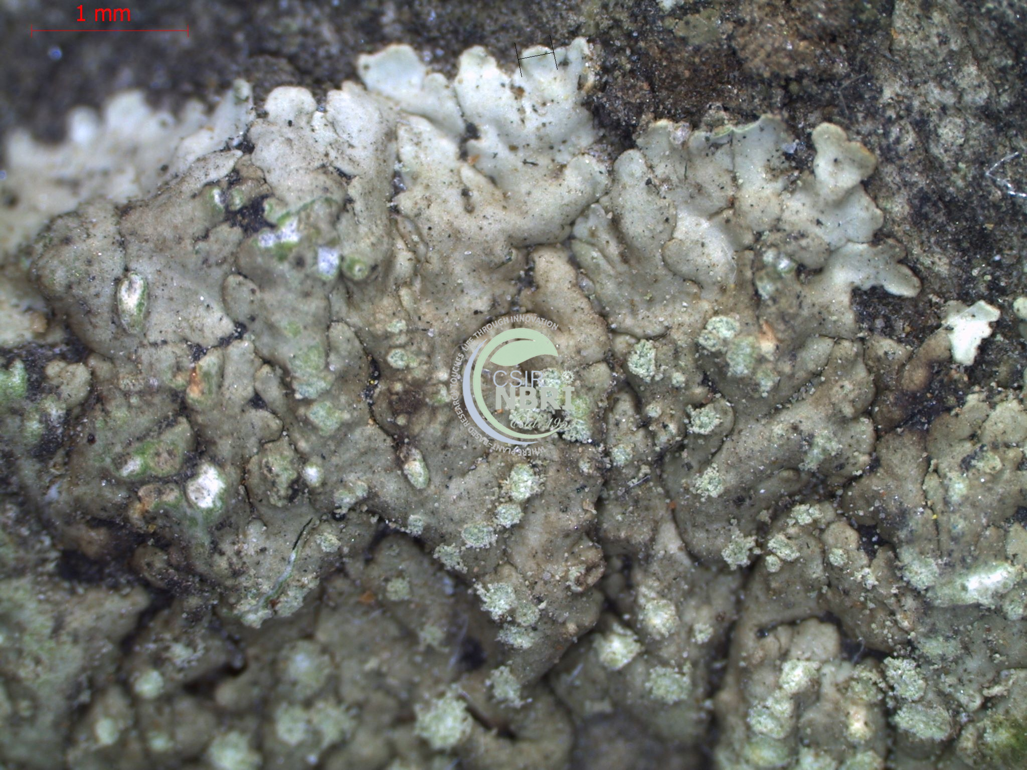 Thallus corticolous, foliose, orbicular, small, 0.6 – 2.4 cm across, greenish grey to brownish, sorediate; lobes minute, 0.2 – 0.4 mm wide, slightly pruinose, free from the substratum; lower surface pale, yellowish white to grey white, rhizinate; rhizines dark grey with white tips; sorelia capitate; soredia granular, greenish; medulla white to greenish. Apothecia absent. Chemistry: K–, C–, KC–, P–. TLC: No chemical detected.