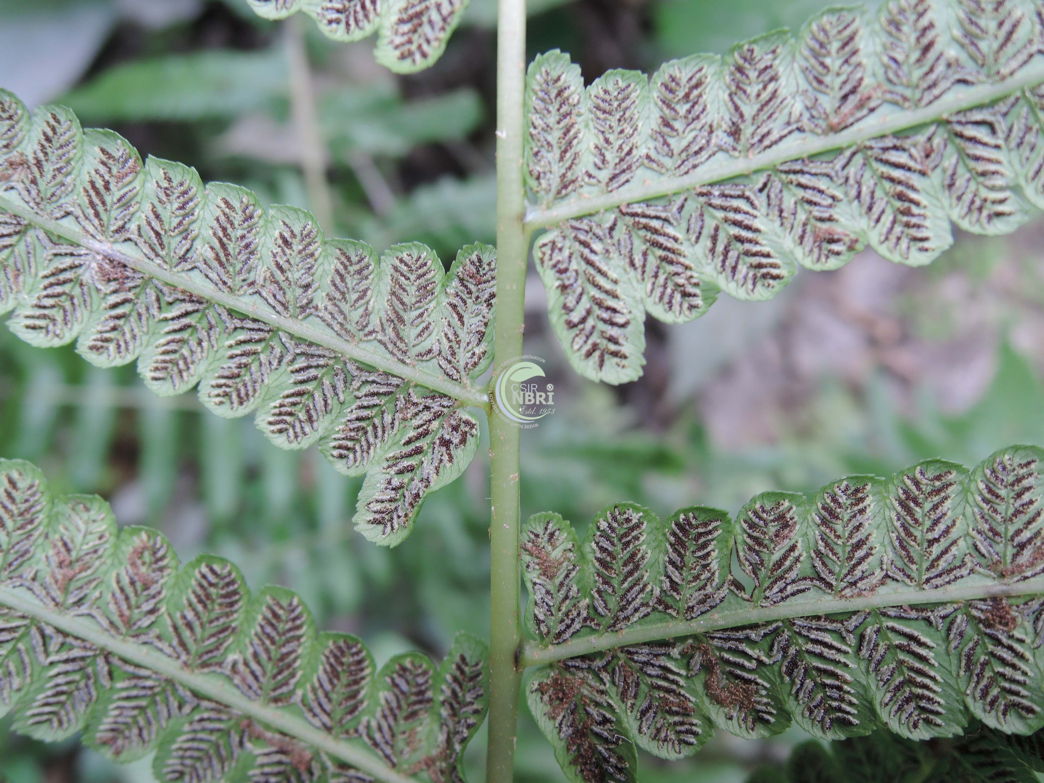 Rhizome erect, densely scaly at the apex. Scales linear-lanceolate. Stipes tufted sparsely scaly at the base, glabrous above. Lamina deltoid, bipinnate with simply pinnate apex. Pinnae up to seven pairs. Veins up to seven pairs, pinnate. Sori linear all along the veins except at the base and apex, indusiate. Indusia pale brown with wavy margin. Spores exine densely, finely granulose.